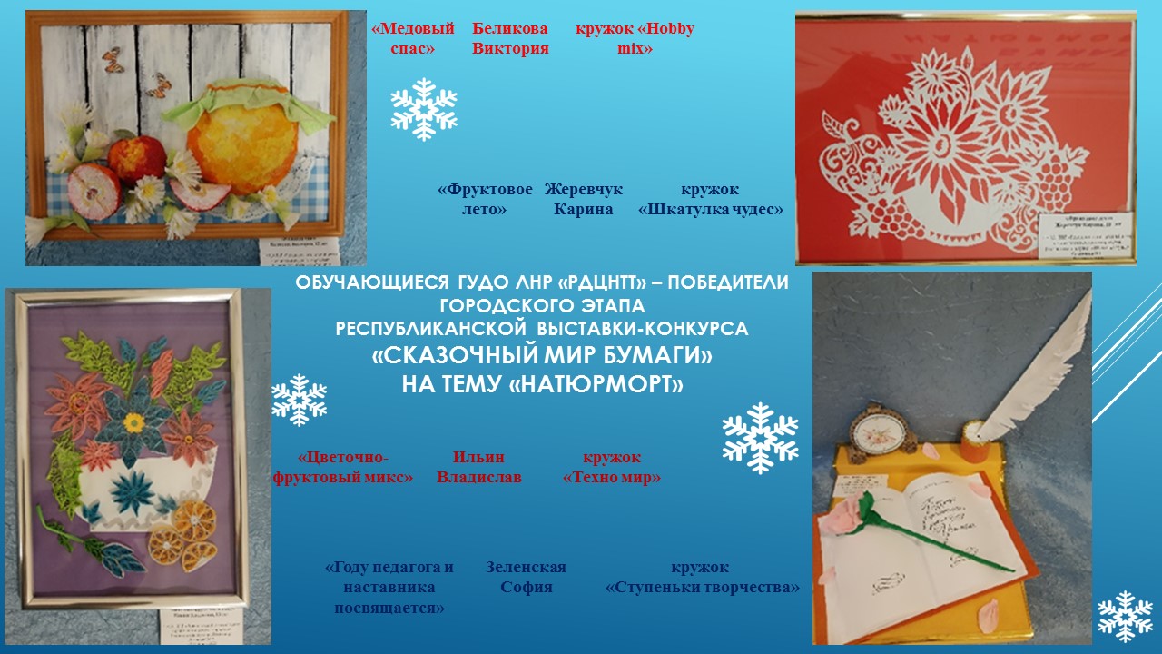 ПОЗДРАВЛЯЕМ ПОБЕДИТЕЛЕЙ ГОРОДСКОГО ЭТАПА РЕСПУБЛИКАНСКОЙ ВЫСТАВКИ-КОНКУРСА "СКАЗОЧНЫЙ МИР БУМАГИ" на тема "НАТЮРМОРТ":