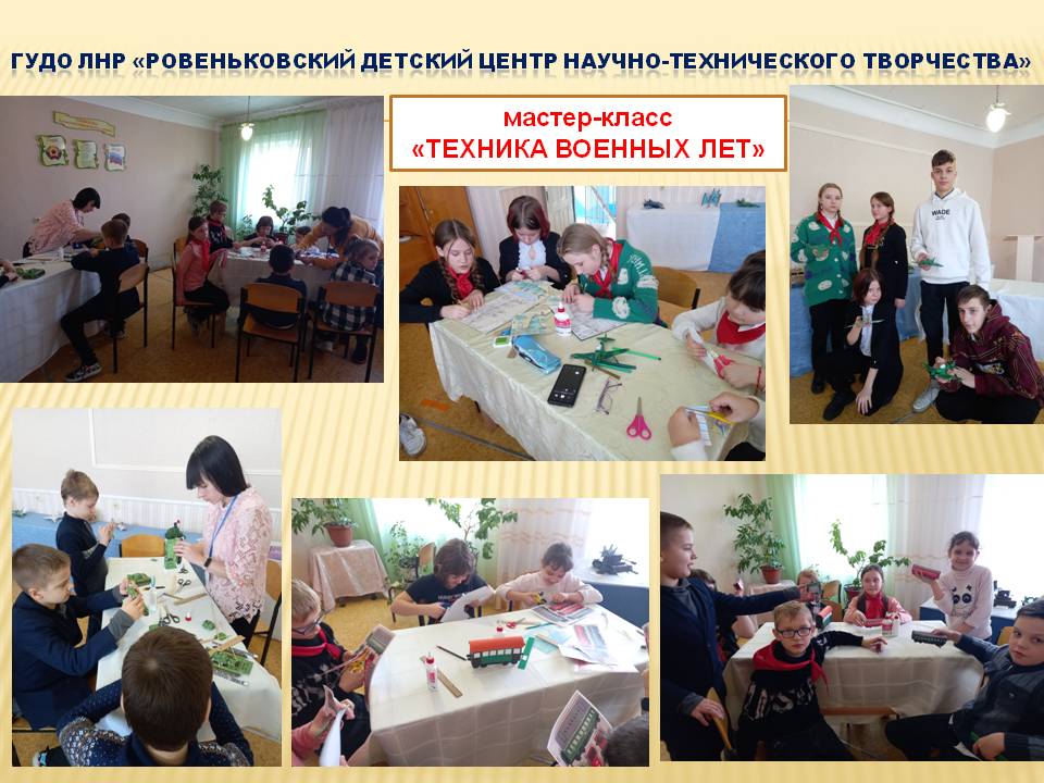 20 января 2023 года педагоги ГУДО ЛНР «Ровеньковский детский центр научно-технического творчества» провели для кружковцев учреждения мастер-классы по изготовлению макетов техники военных лет. Необычным стало то, что педагогам предстояло поработать с детьми, посещающими кружки коллег. Ребятам понравилось данное мероприятие, узнали историю развития техники военных лет, познакомились с новой терминологией, справились с трудностями в соединении деталей.