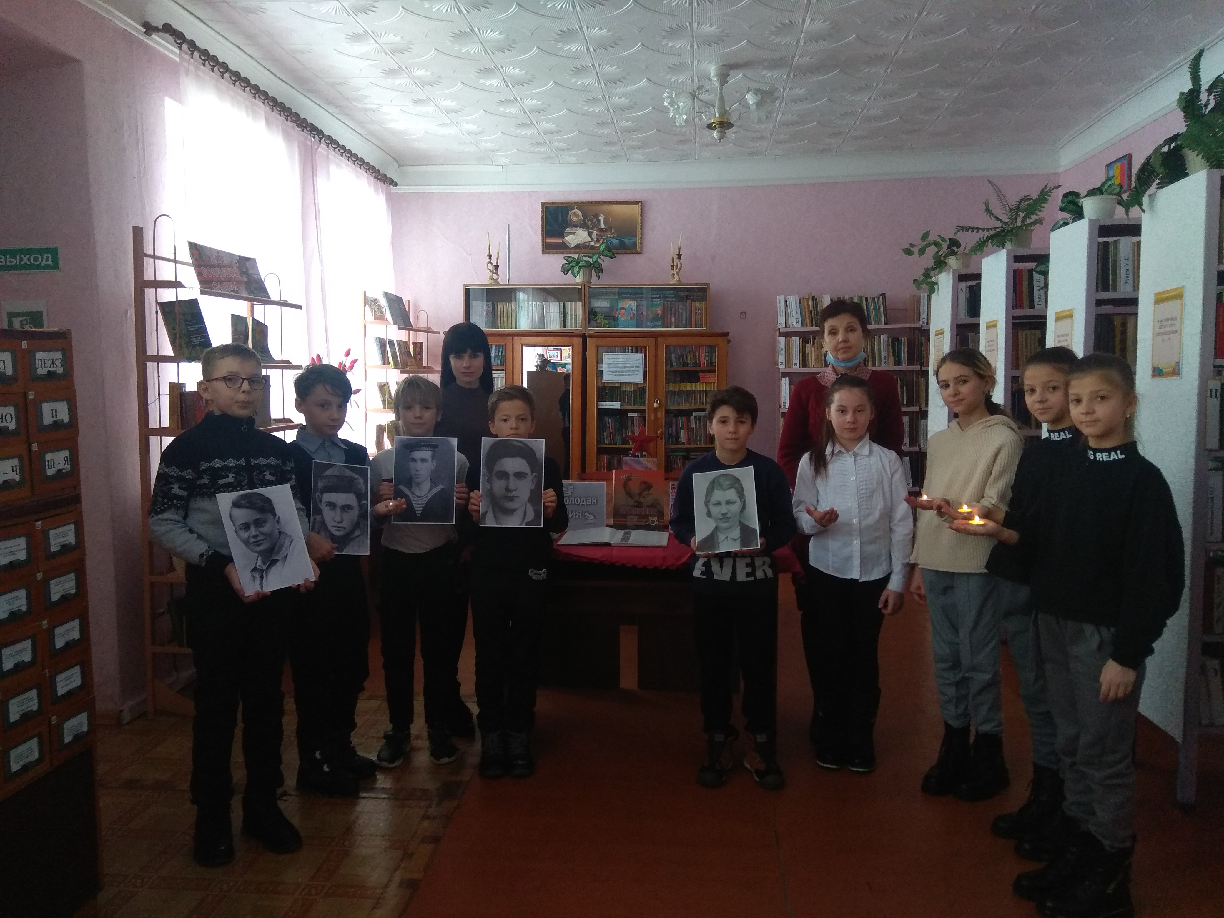 Библиотекарь Костенко Г.И. рассказала присутствующим об истории создания подпольной организации «Молодая гвардия», о молодогвардейцах, девушках и юношах, которые во время оккупации Краснодона встали на защиту своей Родины и своего народа. Ребята узнали об Олеге Кошевом, Ульяне Громовой, Любови Шевцовой, Иване Земнухове… Все, затаив дыхание, слушали о подвигах молодогвардейцев, об их стойкости и мужестве. Не сломленные пытками в фашистских застенках, избравшие смерть, а не предательство, патриоты Краснодона навсегда остались молодыми, из юности шагнув в бессмертие