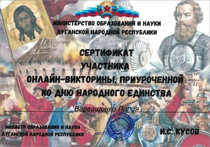 ГУДО ЛНР «Республиканский центр научно-технического творчества» с 3 по 8 ноября 2022 года проводит онлайн-викторину для обучающихся образовательных организаций Республики, посвященную Дню народного единства. 5 обучающихся кружка «Английский язык» (руководитель Данилова А.В.) достойно справились с заданиями и получили сертификаты