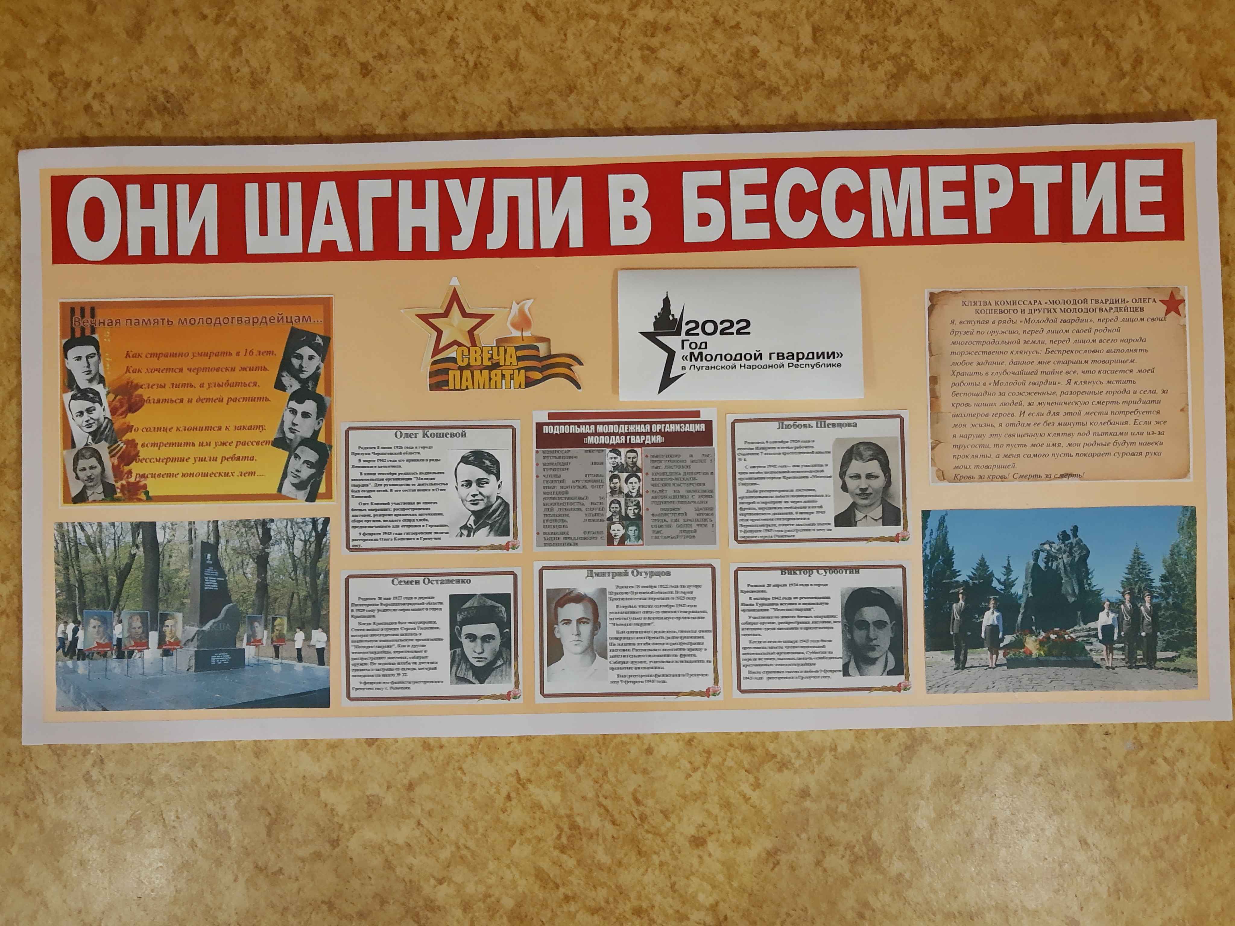 В целом мероприятия прошли организовано. Были обновлены уголки патриотического воспитания, оформлен стенд к 80-летию «Молодой гвардии». Подвиг юных героев-молодогвардейцев, это пример ныне живущим. Подрастающему поколению необходимо знать историю молодогвардейцев, поскольку это, образец героизма и силы духа для сегодняшних юношей и девушек. Память о них будет жить вечно.