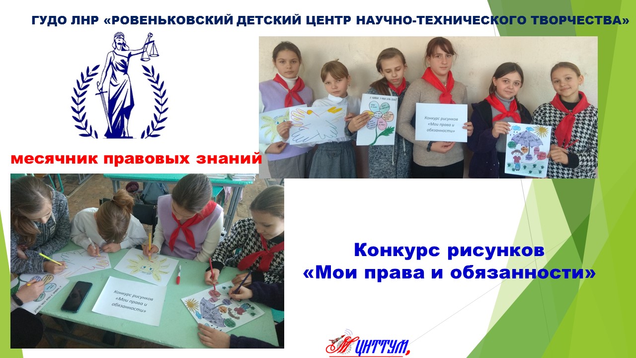 5 декабря 2022 года в кружке «Шкатулка чудес» (руководитель Каралкина Н.С.) ГУДО ЛНР «Ровеньковский детский центр научно-технического творчества» в рамках месячника правовых знаний состоялся конкурс рисунков «Мои права и обязанности». Основные задачи которого: воспитывать правовую культуру кружковцев; подвести обучающихся через рисунки к пониманию, что каждый человек имеет не только права, но и обязанности; формировать общечеловеческие нормы и принципы морали; воспитывать уважительное отношение к правам других людей. В ходе мероприятия, ребята обсудили важность данной темы.
