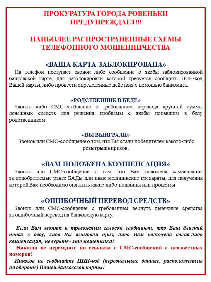 Прокуратура города Ровеньки предупреждает о фактах мошеннических действий, направленных на хищение денежных средств граждан, хранящихся на банковском счете и настоятельно рекомендует ознакомиться с наиболее распространенными схемами телефонного мошенничества.