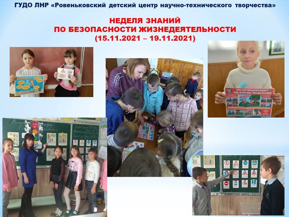 Врамках Недели знаний по безопасности жизнедеятельности, которая проходила с 15 по 19 ноября 2021 года, в ГУДО ЛНР «Ровеньковский детский центр научно-технического творчества» состоялись единые классные часы на темы: «Внимание, взрывоопасные предметы!» и «Основы электробезопасности».